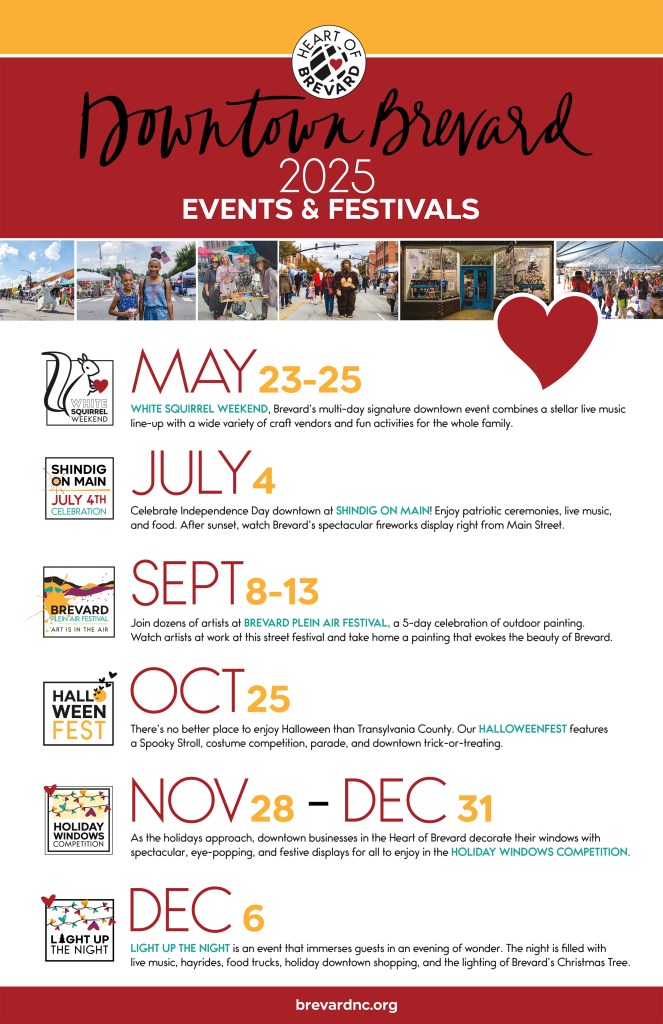 Events Upcoming Local Events: Heart Of Brevard 2025 Events! White Squirrel Festival For a more extensive list of local events, check out the Facebook Events page! <–Click Share this: Click to share on Facebook (Opens in new window) Facebook Click to share on X (Opens in new window) X Click to email a link to a friend (Opens in new window) Email